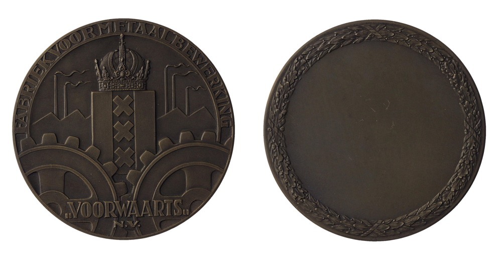 voorzijde: het gekroonde wapen van Amsterdam tussen fabrieken met rokende schoorstenen, middenonder tussen twee kamraderen. Geheel onderaan een opschrift, bovenaan een omschrift.
