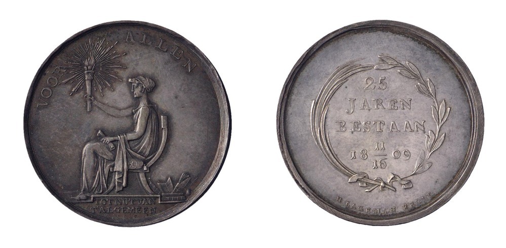 voorzijde: een zittende vrouw naar links met in haar vooruitgestoken rechterhand een brandende toorts met lichtstralen. Achter haar zetel liggen deels opengeslagen boeken. Bovenaan een omschrift en in de afsnede een opschrift en signatuur.