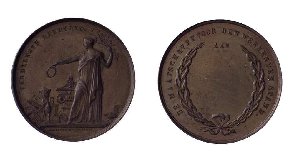 omschrift keerzijde: DE MAATSCHAPPIJ VOOR DEN WERKENDEN STAND.