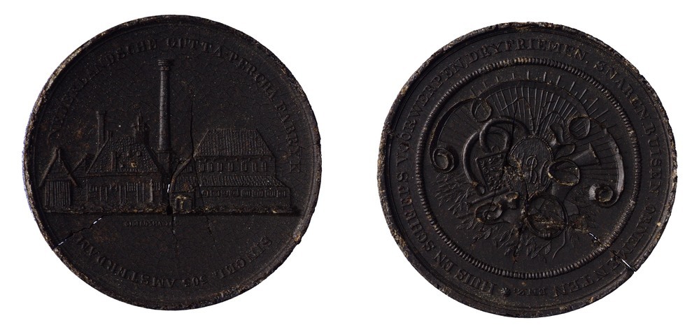 voorzijde: in een omschrift de Gutta-Percha fabriek in Amsterdam aan het Singel 505. In de afsnede een signatuur.
