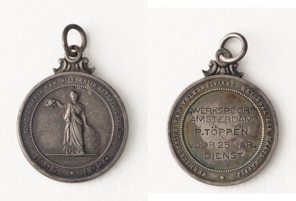 opschrift keerzijde: "WERKSPOOR" / AMSTERDAM / P.TÖPPEN / VOOR 25 JAR. / DIENST