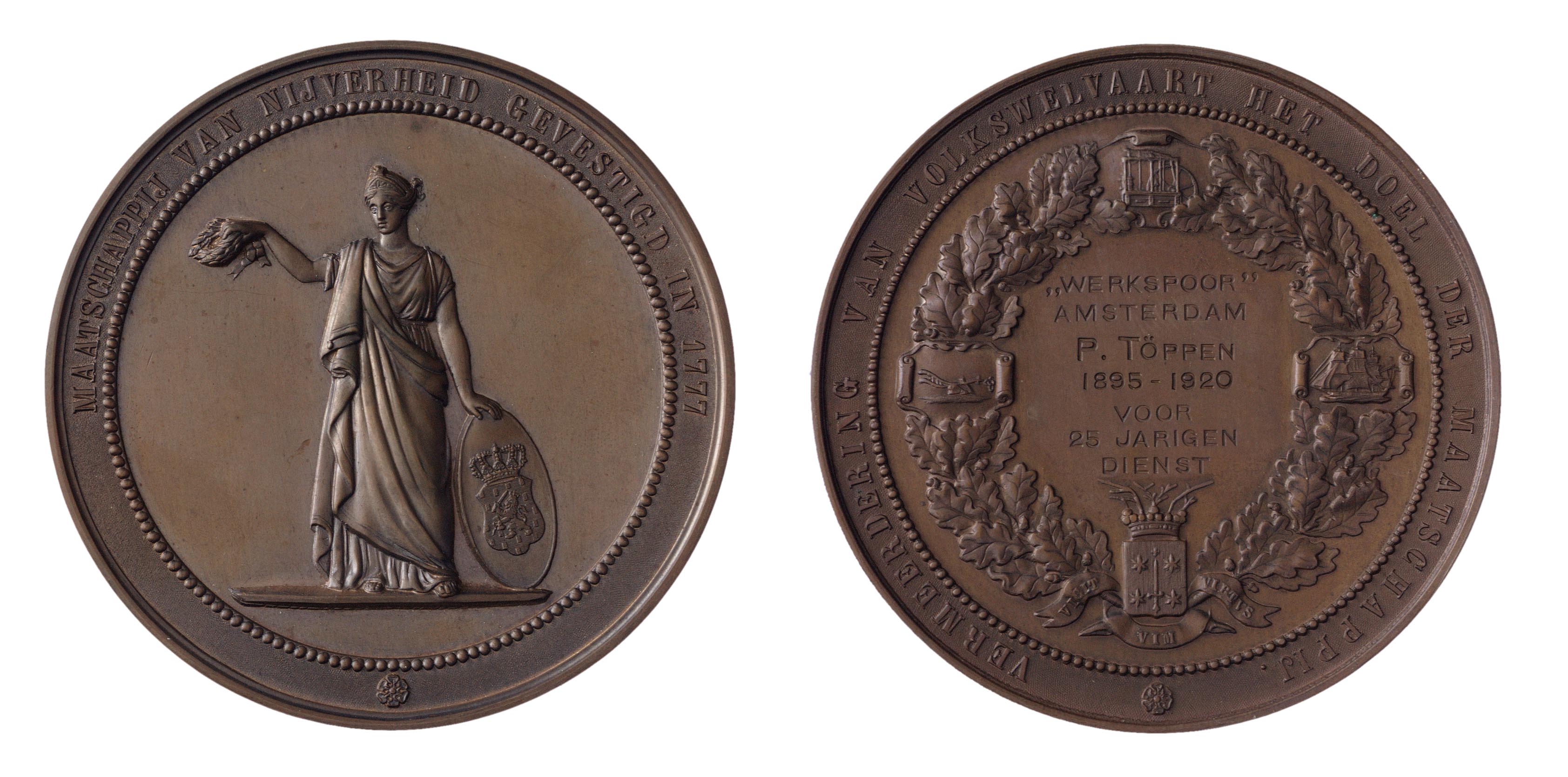 opschrift keerzijde: "WERKSPOOR" / AMSTERDAM / P.TÖPPEN / 1895 - 1920 / VOOR 25 JARIGEN / DIENST