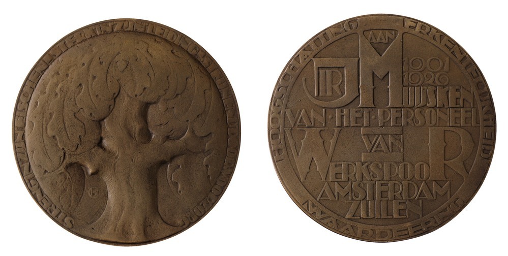 opschrift keerzijde: AAN / IR.J. MUYSKEN / 1901 / 1926 / VAN.HET.PERSONEEL / VAN / WERKSPOOR / AMSTERDAM / ZUILEN