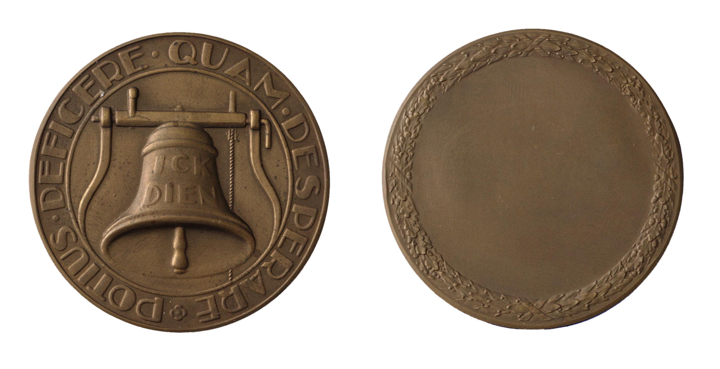 voorzijde: een omschrift waarbinnen een rand en een klokstoel met klok en klepel en een luidtouw. Op de klok een opschrift. keerzijde: een viermaal gestrikte eiknblad- lauwerbladkrans waarbinnen een leeg veld.- Trefwoorden