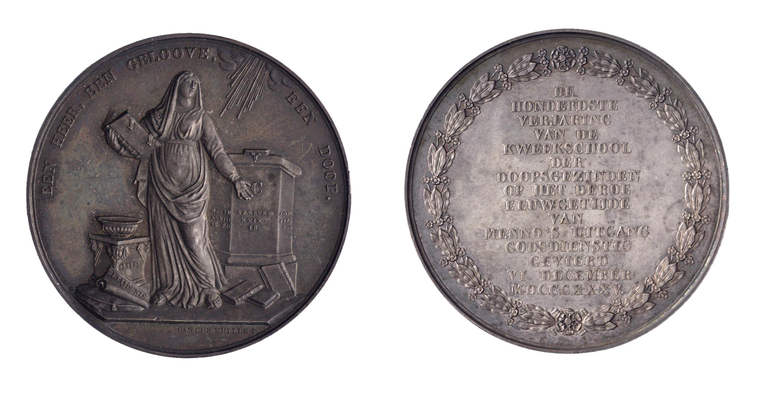 opschrift keerzijde: DE / HONDERDSTE / VERJARING / VAN DE / KWEEKSCHOOL / DER / DOOPSGEZINDEN / OP HET DERDE / EEUWGETIJDE / VAN / MENNO'S UITGANG / GODSDIENSTIG / GEVIERD / VI DECEMBER / MDCCCXXXV.