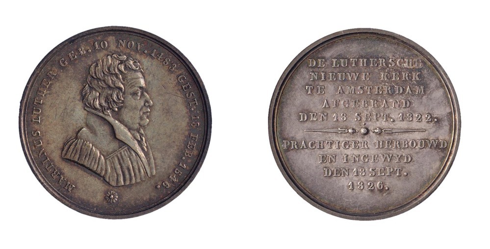 opschrift keerzijde: DE LUTHERSCHE / NIEUWE KERK / TE AMSTERDAM / AFGEBRAND / DEN 18 SEPT. 1822 / -~- / PRACHTIGER HERBOUWD / EN INGEWIJD / DEN 18 SEPT. / 1826.
