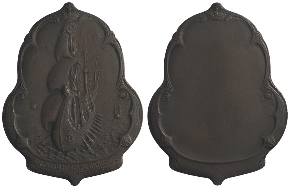 voorzijde: een galei met masten en volle zeilen, met bovenin de mast een koningskroon, met roeiers en roeispanen, schuin naar voren zeilend en roeiend, aan weerszijde roeibootjes, in de kwabachtige rand zit rechts een anker als wapen van de vereniging en links in de kwabachtige rand het wapen van Nederland. Onderaan een veld met opschrift.