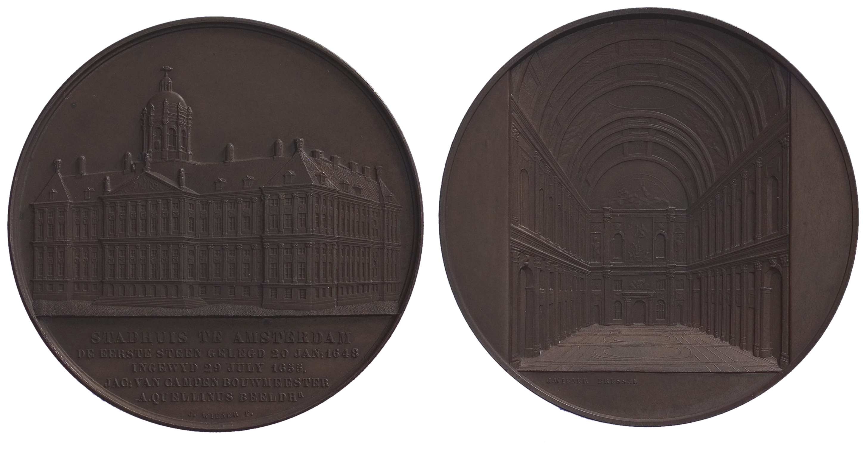 opschrift voorzijde in de afsnede: STADHUIS TE AMSTERDAM / DE EERSTE STEEN GELEGD 10 JAN:1648 / INGEWYD 29 JULY 1655 / JAC:VAN CAMPEN BOUWMEESTER / A.QUELLINUS BEELDHR