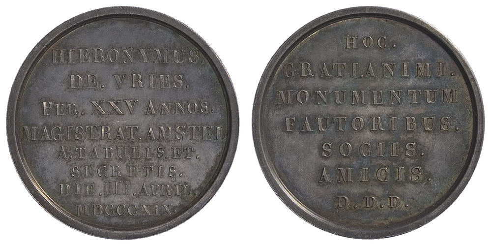 Jeronimo de Vries, 25 jaar secretaris van Amsterdam, 1819 zilver hoogte: 4.0 cm; breedte: 4.0 cm; diepte: 0.3 cm; gewicht: 20.85 gr; opschrift voorzijde: HIERONYMUS / DE. VRIES. / PER. XXV ANNOS. / MAGISTRAT. AMSTEL / A.TABULIS. ET. / SECRETIS. / DIE. III. APRIL. / MDCCCXIX.