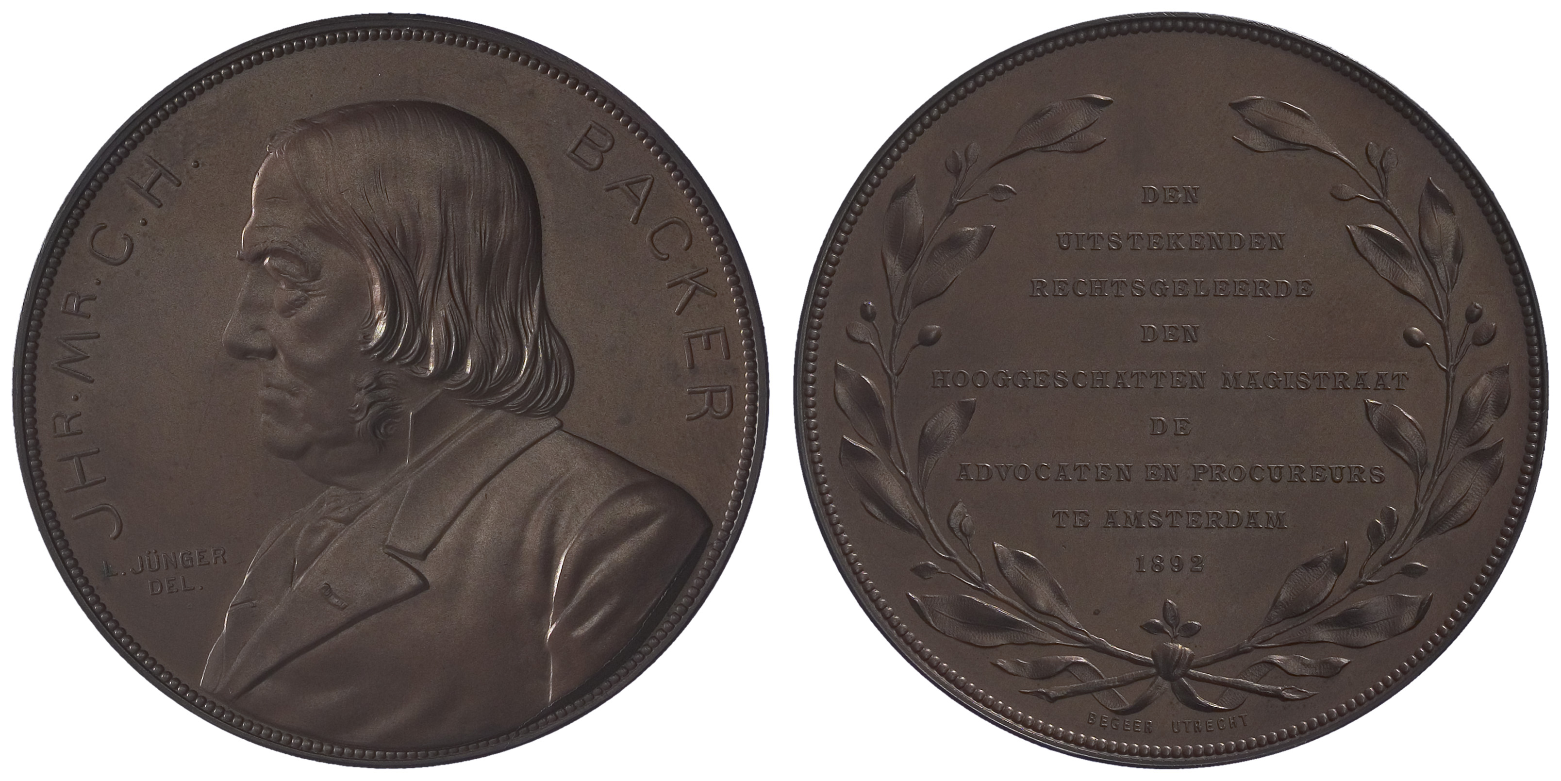 Ter gelegenheid van zijn aftreden als president van de Rechtbank te Amsterdam, welke functie hij van 1876 tot 1892 had vervuld, kreeg Jhr. Mr. Cornelis H. Backer een penning met zijn portret aangeboden door de advocaten en procureurs. ( Judith van Gent)