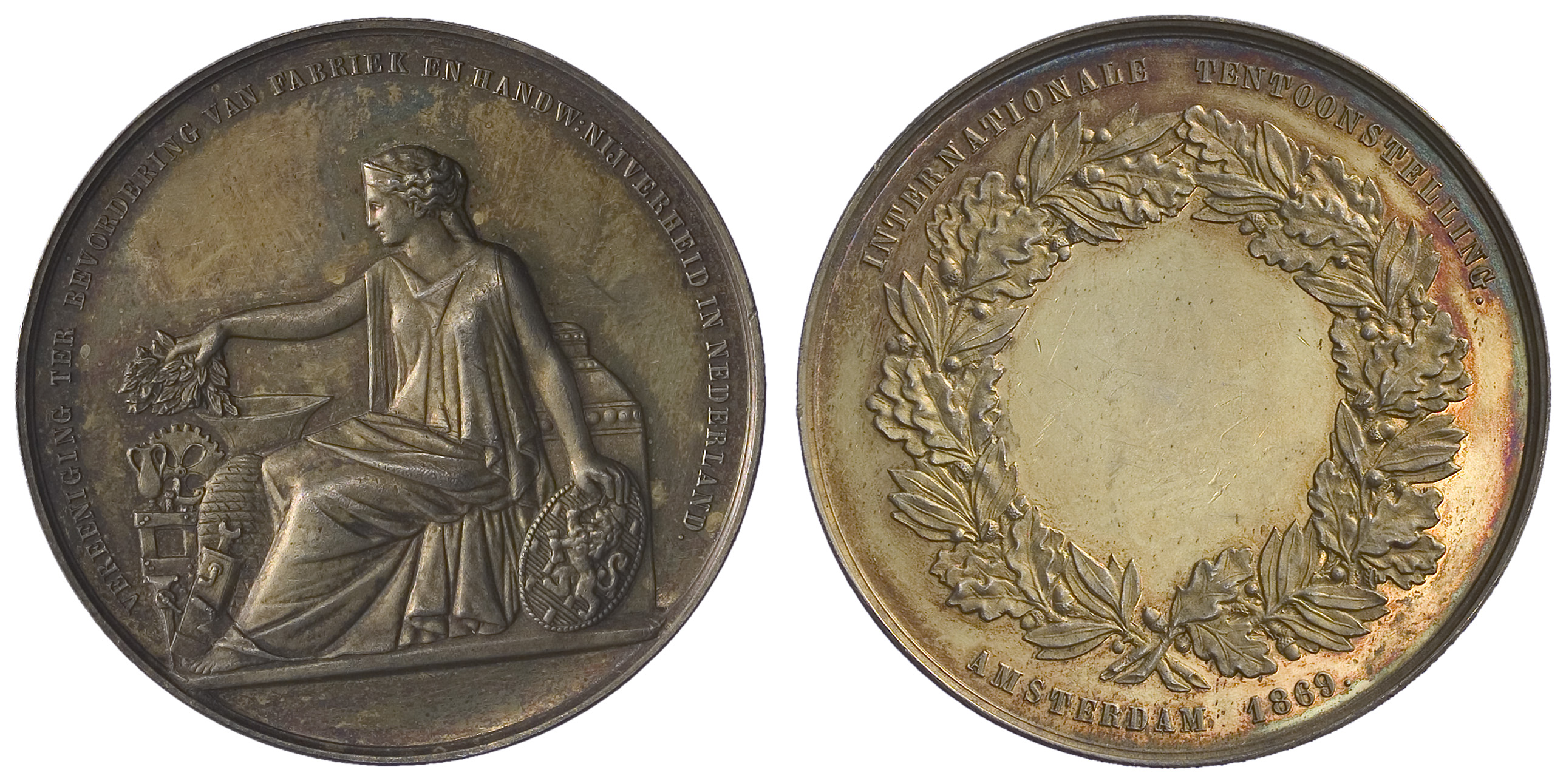 1869, fabriek en handwerksnijverheid, internationale tentoonstelling te Amsterdam, 1869, prijspenning der vereniging ter bevordering van fabriek en handwerknijverheid, 1869
