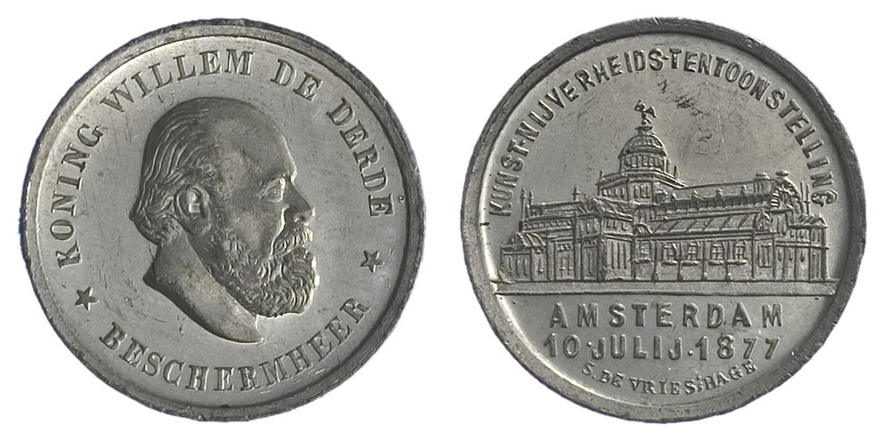 keerzijde: een afbeelding van het Paleis voor Volksvlijt te Amsterdam met een omschrift en een opschrift in de afsnede.