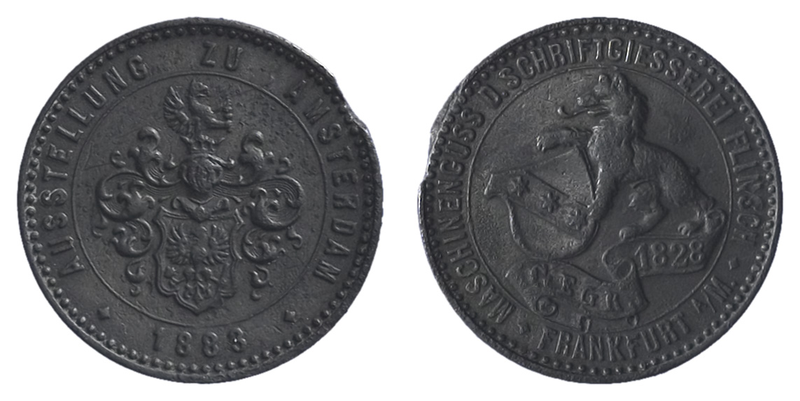 omschrift keerzijde: MASCHINENGUSS D.SCHRIFTGIESSEREI FLINSCH * FRANKFURT A/M *