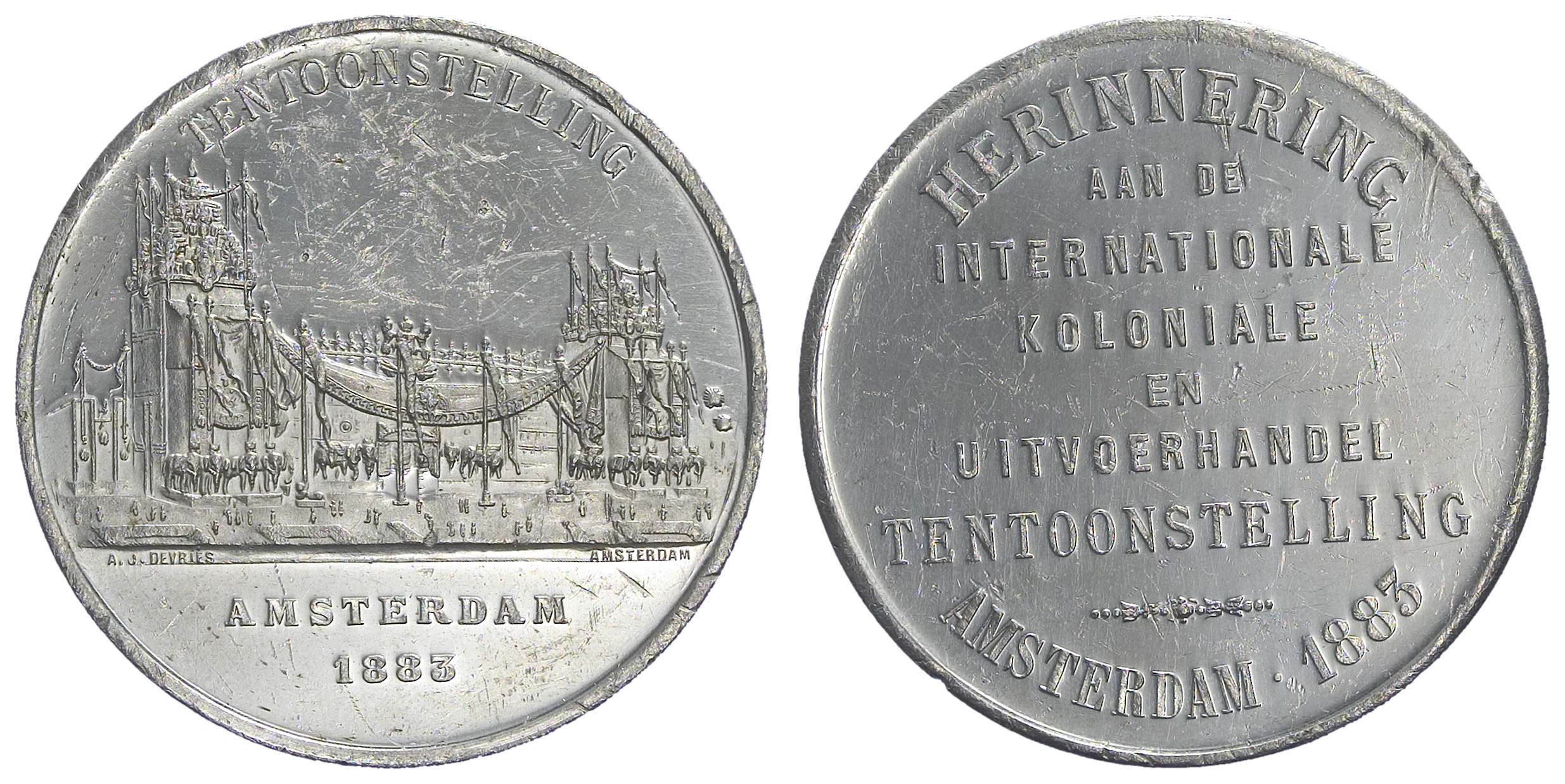 opschrift keerzijde: HERINNERING / AAN DE / INTERNATIONALE / KOLONIALE / EN / UITVOERHANDEL / TENTOONSTELLING / AMSTERDAM . 1883
