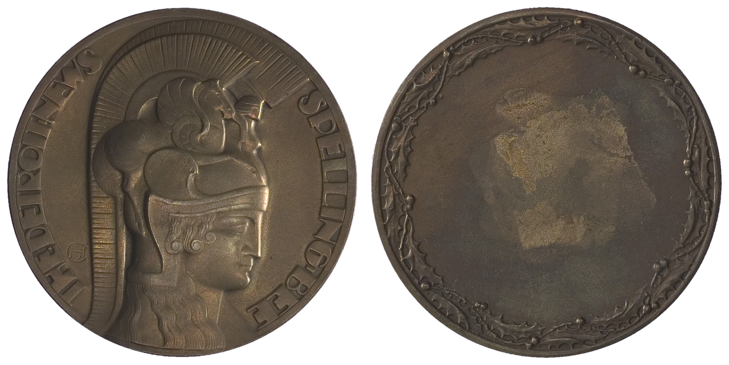 voorzijde: in een omschrift een rechtsgewend borstbeeld van Minerva met helm waarop een meervoudige hanekam met een sfinx en een pegasus. Linksonder een signatuur in de vorm van een monogram.