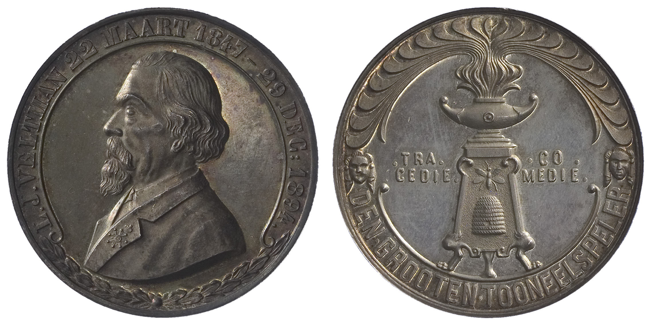 voorzijde: in een omschrift het naar links gewende borstbeeld van Louis Jacques Veltman (1817-1907). Onderaan een gestrikte lauwertak.