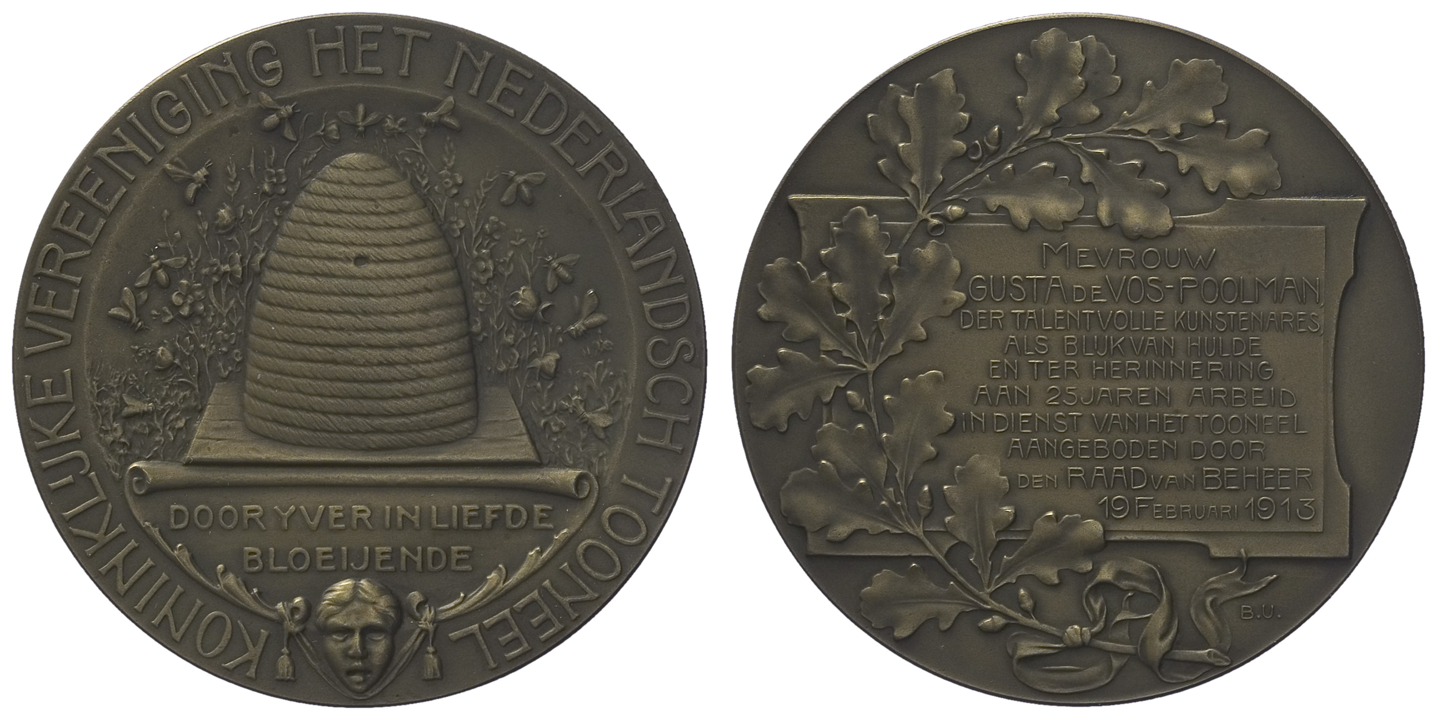 opschrift: MEVROUW / GUSTA DE VOS-POOLMAN / DER TALENTVOLLE KUNSTENARES / ALS BLIJK VAN HULDE / EN TER HERINNERING / AAN 25 JAREN ARBEID / IN DIENST VAN HET TONEEL / AANGEBODEN DOOR / DEN RAAD VAN BEHEER 19 FEBRUARI 1913