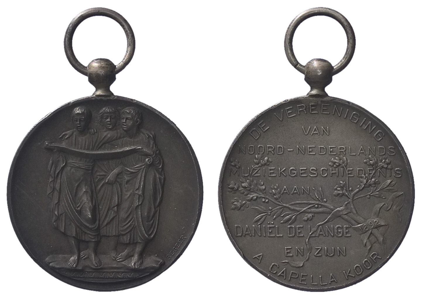 opschrift keerzijde: DE VEREENIGING / VAN / NOORD-NEDERLANDS / MUZIEKGESCHIEDENIS / AAN / DANIEL DE LANGE / EN ZIJN / A CAPELLA KOOR