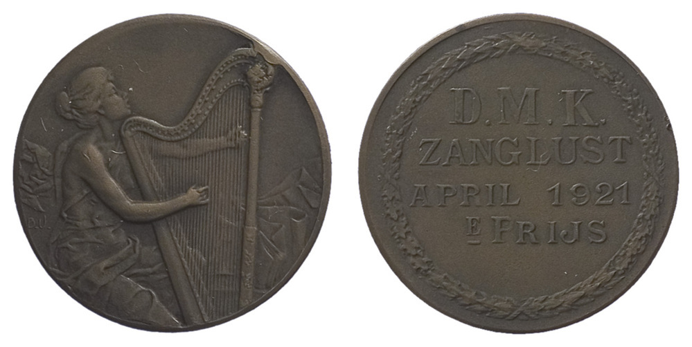 voorzijde: een jonge vrouw naar rechts gewend kniestuk, bespeelt een harp. keerzijde: een eikenloof- lauwerkrans rond een opschrift.- Trefwoorden