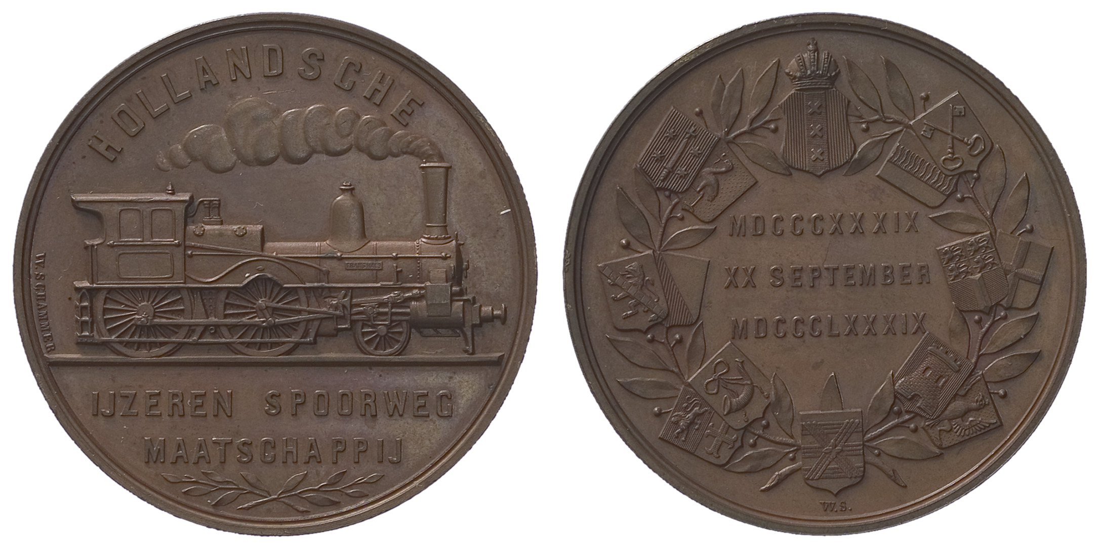 voorzijde: een omschrift waarin een stomende stoomlocomotief. Links een signatuur. In de afsnede een opschrift. Daaronder twee lauwertakken.