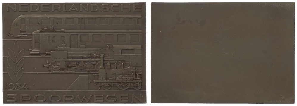 voorzijde: bovenaan en onderaan de rechthoekige penning een opschrift. Daartussen van boven naar beneden (naar links): een dieseltrein, een elektrische trein, het laatste model lokomotief, de eerste lokomotief uit 1839 met stootblok. Linksonder een jaartal met lauwertak.