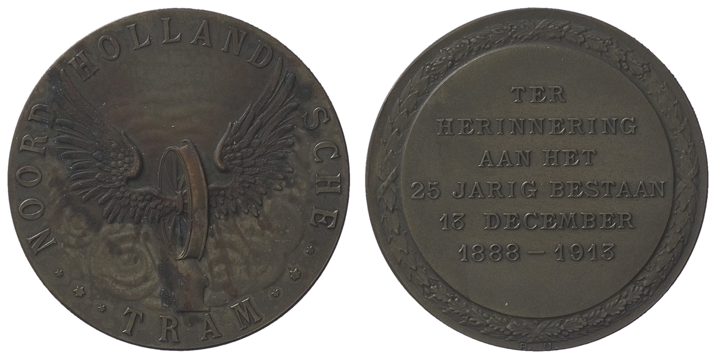 opschrift keerzijde: TER / HERINNERING / AAN HET / 25 JARIG BESTAAN / 13 DECEMBER / 1888 - 1913 - schenking 1929