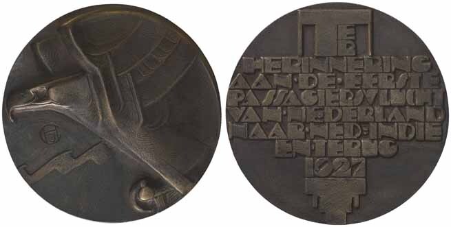 opschrift keerzijde: TER / HERINNERING / AAN.DE.EERSTE / PASSAGIERSVLUCHT / VAN.NEDERLAND / NAAR.NED:INDIE / EN.TERUG / 1927 - onbekende verwerving
