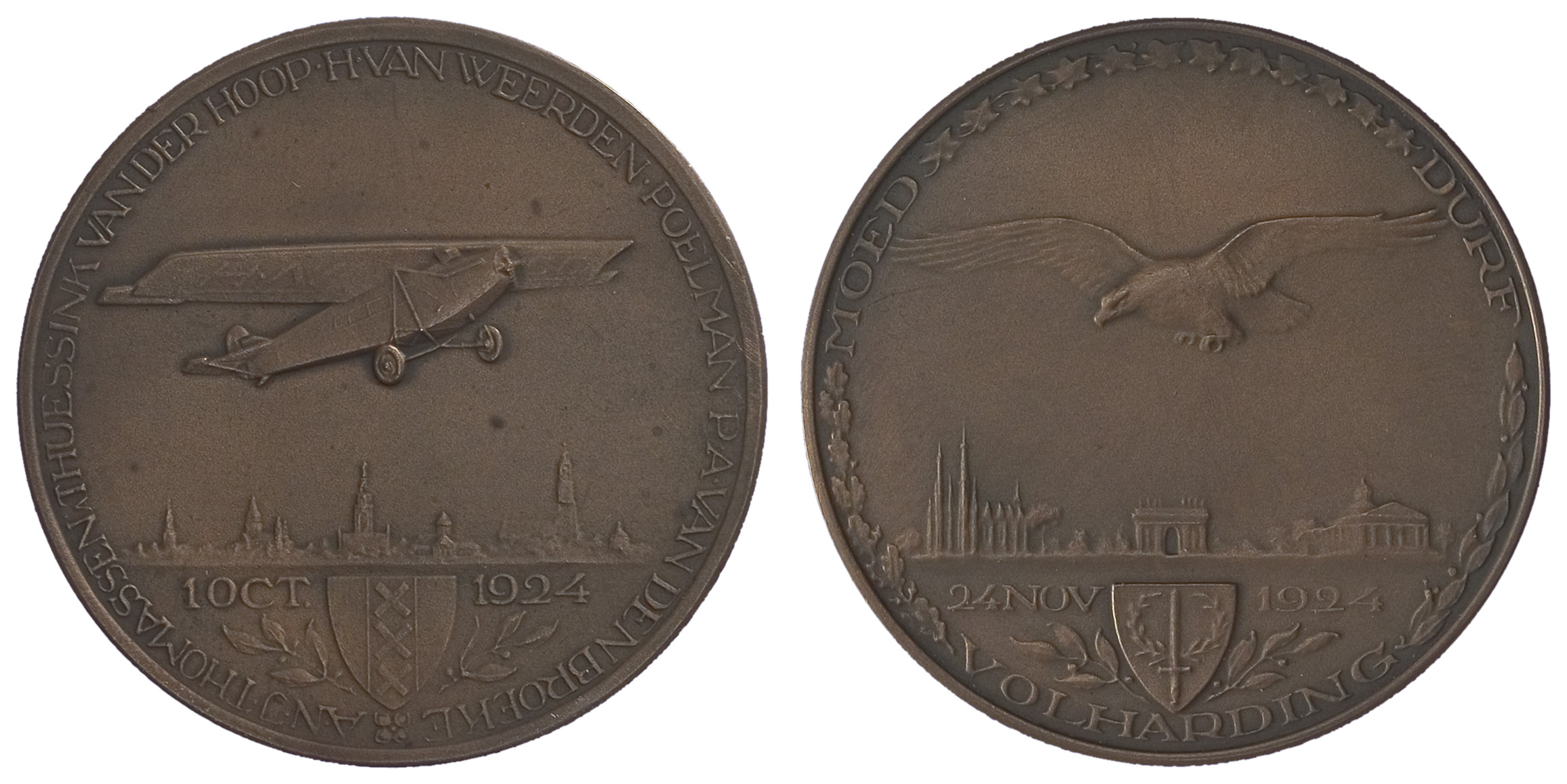 voorzijde: in een omschrift een éénmotorig vliegtuig schuin naar rechts vliegend boven het silhouet van de stad Amsterdam. Aan de onderkant van de vleugels het registratiekenmerk HN CC. In de afsnede het stadswapen van Amsterdam, omgeven door lauwertakken en een datum.