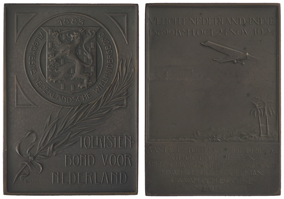 opschrift keerzijde onder: AAN HET STOUTMOEDIGE DRIETAL / GROOTTOERISTEN A.N.J.THOMASSEN A THUESSINK V.D.HOOP / H. VAN WEERDEN POELMAN / P.A. VAN DEN BROEKE.