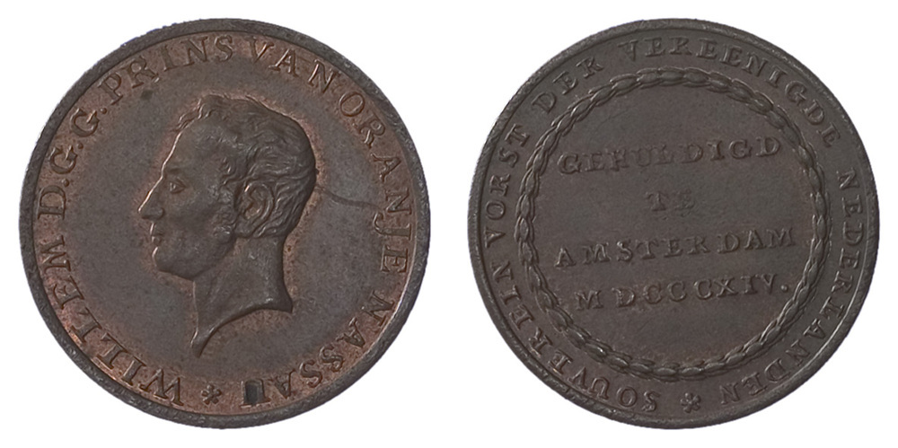 opschrift keerzijde: GEHULDIGD / TE / AMSTERDAM / MDCCCXIV.