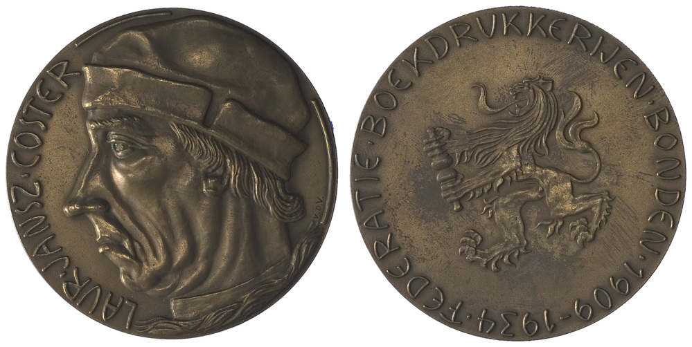 voorzijde: het links gewend hoofd met hoofddeksel van Coster, met zijn naam langs de linker zijde. Geheel rechts initialen.