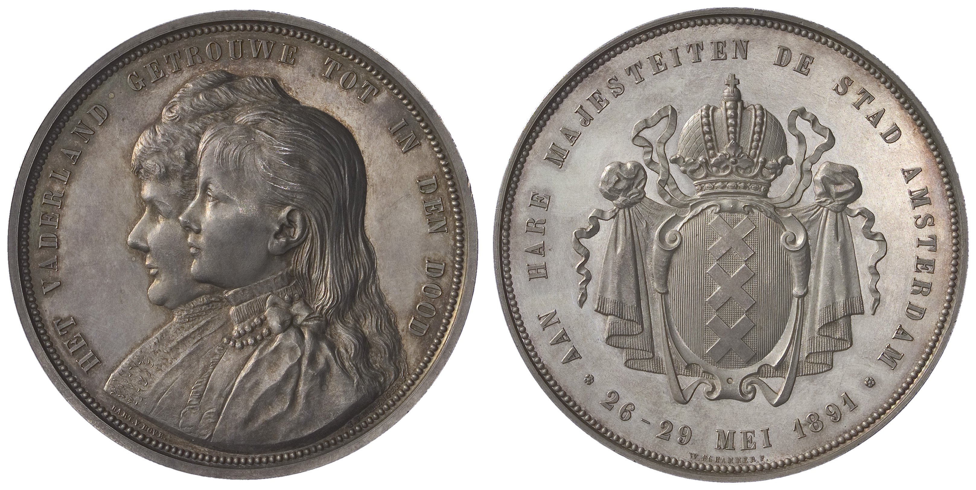 omschrift keerzijde: AAN HARE MAJESTEITEN / DE STAD AMSTERDAM * 26-29 MEI 1891 *