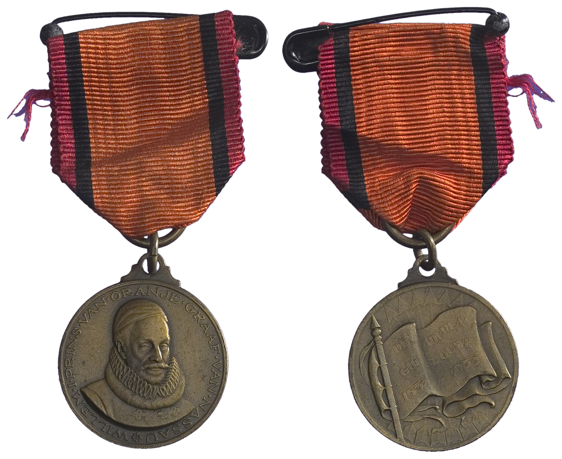 keerzijde: zeven pijlen, waaroverheen een wapperende vlag met wimpel. Op de vlag een opschrift. Aan de penning een oog met rand en twee ringen, waaraan een rood-zwart-oranje lint met speld voor bevestiging.