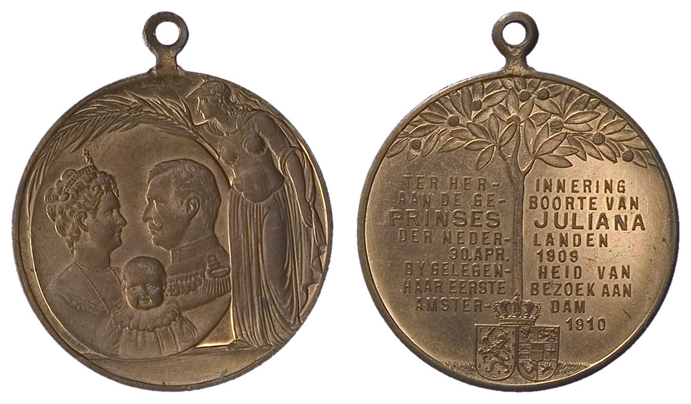 opschrift keerzijde links-rechts: TER HERINNERING / AAN DE GEBOORTE VAN / PRINSES JULIANA / DER NEDERLANDEN / 30. APR. 1909 / BY GELEGENHEID VAN / HAAR EERSTE BEZOEK AAN / AMSTERDAM 1910