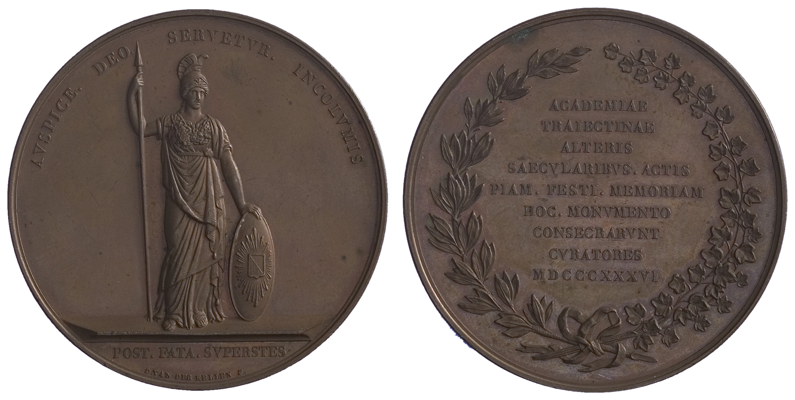 opschrift keerzijde: ACADEMIAE / TRAIECTINAE / ALTERIS / SAECVLARIBVS. ACTIS / PIAM. FESTI. MEMORIAM / HOC. MONVMENTO / CONSECRARVNT / CVRATORES / MDCCCXXXVI.