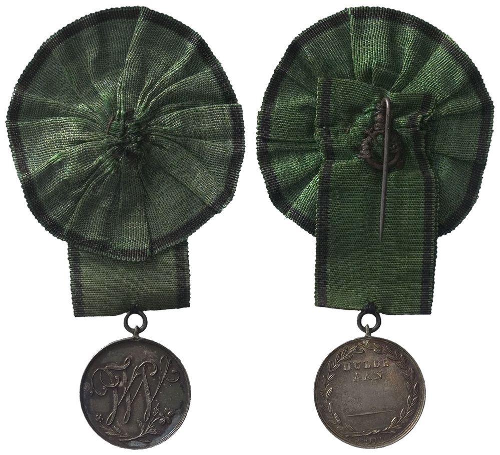 keerzijde: in een gestrikte bladkrans een opschrift. Onderaan een signatuur. de penning heeft bovenaan een og, waaraan een groen stoffen lint met groen stoffen rozet met smalle zwarte rand.