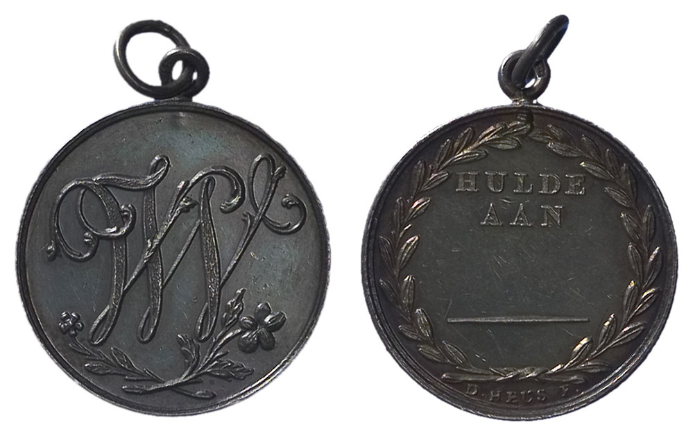 voorzijde: een monogram van de letters VW, waaronder twee gekruiste bloemtakken. Bovenaan een oog met ring.