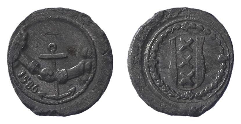 voorzijde: het stadswapen van Amsterdam in een lauwerkrans. keerzijde: een gevleugelde arm rechts waarvan de hand op het anker van de hoop aan een behoeftige de hand drukt boven het jaartal 1586.- Trefwoorden