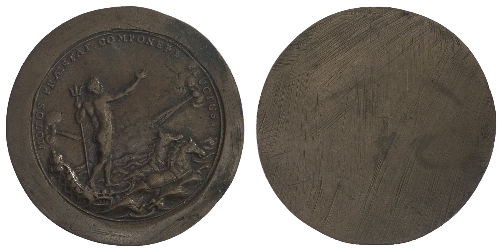 voorzijde: in een omschrift staat Neptunus op zijn wagen, voorzien van het gekroonde wapen van Amsterdam, getrokken door twee paarden naar rechts in een woelige zee. In zijn linkerhand houdt hij een drietand, met zijn rechterhand reikt hij naar schuin boven. Links en vanuit rechtsboven blaast de wind. IJsvogels vliegen uit hun nest.