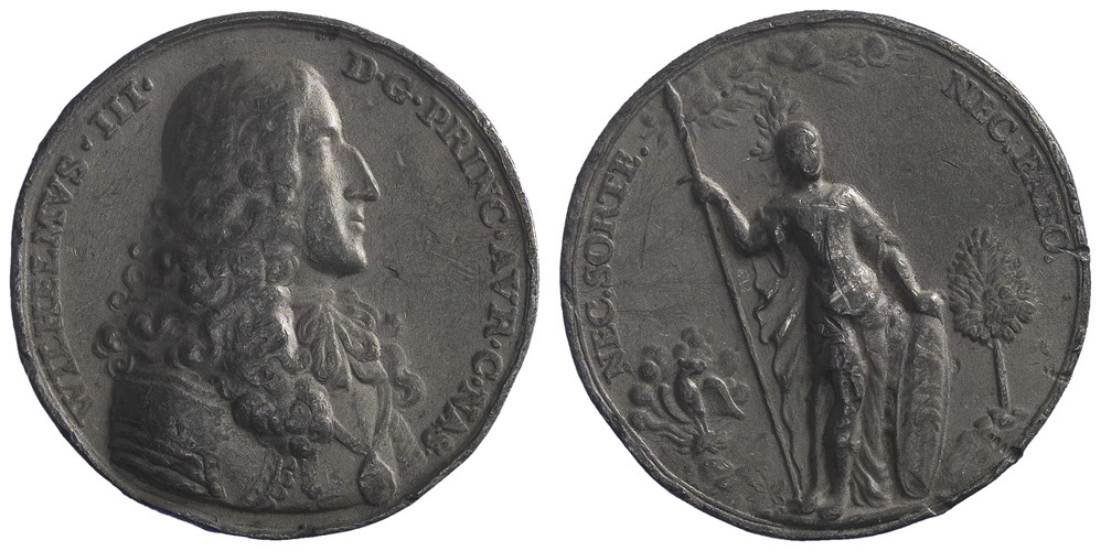 omschrift voorzijde: WILHELMUS . III . D.G. PRINC.AVR.C.NAS.