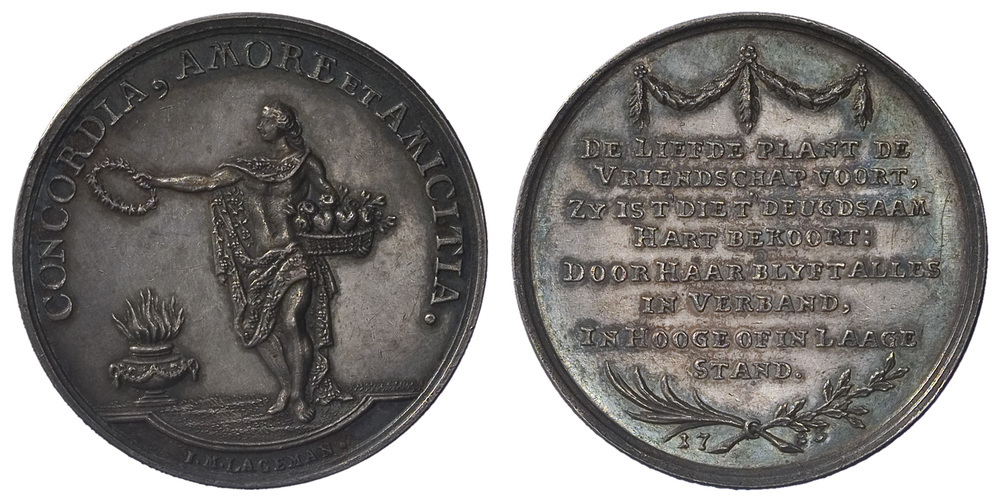 opschrift keerzijde: DE LIEFDE PLANT DE / VRIENDSCHAP VOORT, / ZY IS T DIE T DEUGDSAAM / HART BEKOORT: / DOOR HAAR BLYFT ALLES / IN VERBAND, / IN HOOGE OF IN LAAGE / STAND.