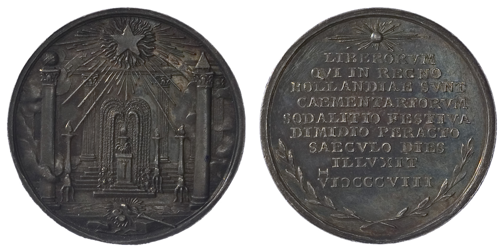 opschrift keerzijde: LIBERORVM / QVI IM REGNO / HOLLANDIAE SVNT / CAEMENTARIORVM / SODALITIO FESTIVA / DIMIDIO PERACTO / SAECVLO DIES / ILLVXIT / HVICCCCVIII