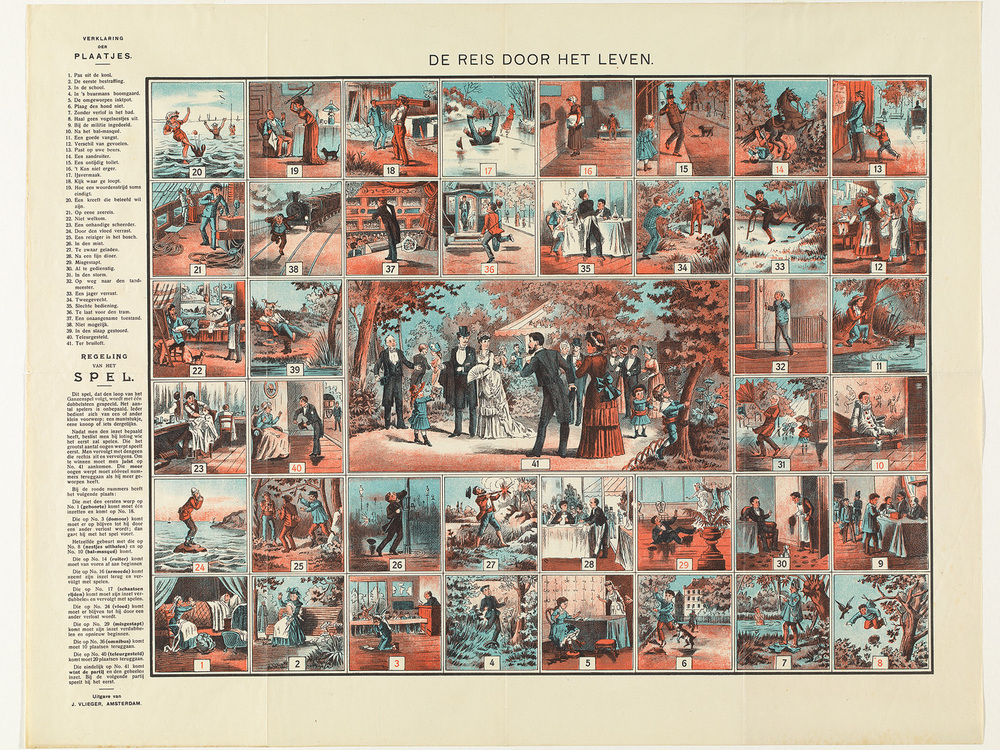 In het spel 'Reis door het Leven' moeten de spelers zich door hun jeugd heen zien te redden. Men begint op vakje 1, de geboorte, en eindigt op vakje 41, het huwelijk. De tussenliggende vakjes beelden situaties en obstakels uit, met aansprekende titels als 'Plaag den hond niet' en 'Te laat voor den tram'. Wie zich niet te veel plaatsen terug laat zetten door deze vakjes en als eerste zijn of haar bruiloft bereikt, wint het spel. ( Sarah Remmerts de Vries)