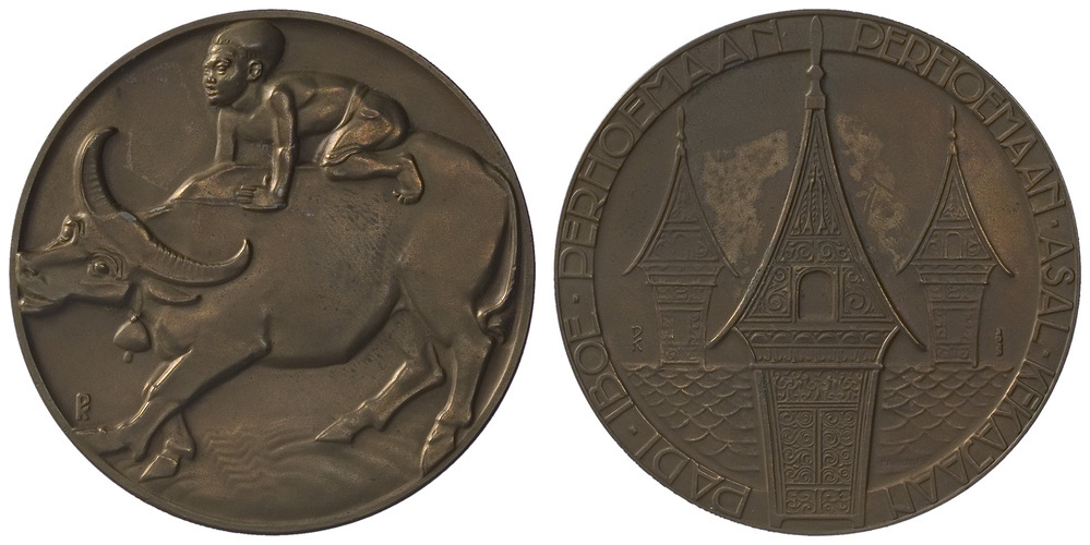 voorzijde: een Indonestisch kind (katjong) op de rug van een karbouw naar links. Linksonder een signatuur van de opdrachtgever.