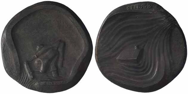 voorzijde: huis omgeven door water in reliëf, hierboven datum. keerzijde: twee dijkwerkers die een gat dichten in de dijk in reliëf, met signatuur en datum.- Trefwoorden