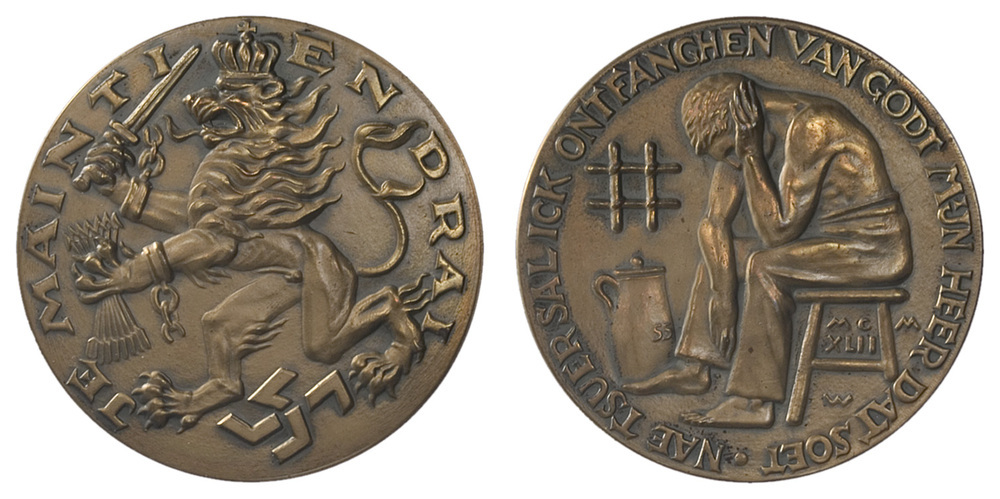 keerzijde: een omschrift waarbinnen man naar links, ontbloot bovenlijf, blootsvoets, zittend op een kruk, voorovergebogen het hoofd steunend op de linkerarm. Links tralies, daaronder een hoge kan met deksel. Onder de kruk de Romeinse cijfers: MCMXLII en een monogram W.