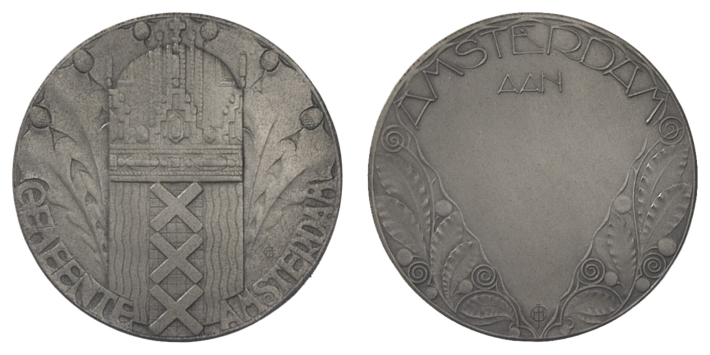 voorzijde: het gekroonde wapen van Amsterdam, tussen gestyleerde eikenbladeren en eikels. Langs de benedenrand een omschrift.