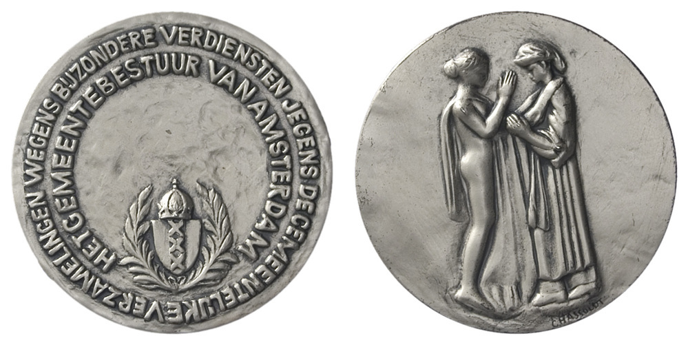 omschrift voorzijde: WEGENS BIJZONDERE VERDIENSTEN JEGENS DE GEMEENTELIJKE VERZAMELINGEN / HET GEMEENTEBESTUUR VAN AMSTERDAM