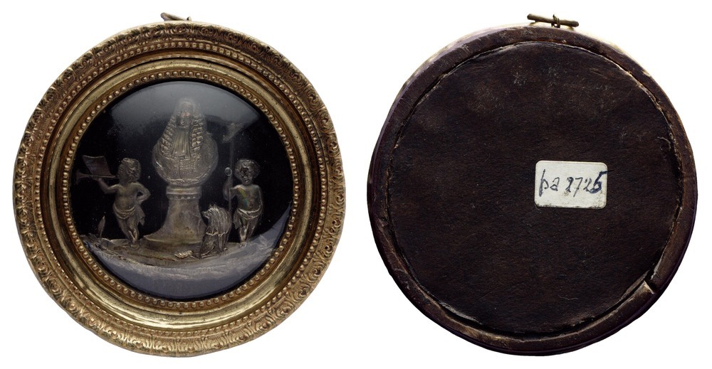 in een rond verguld lijstje, met versierde rand en dubbele parelcirkel een éénzijdige voorstelling, ajour, op zwart fluweel fond: het borstbeeld van Hooft, met pruik, mantel en bef, geplaatst op een voetstuk, waarop een tekst. Links een putto met bazuin, rechts een putti met vrijheidshoed op een stok. Naast het voetstuk een hond.