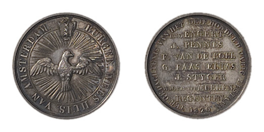 opschrift keerzijde: D.W.ENGEL / J. PENNIS / F. VAN DE POLL / G. FAAS ELIAS / J. STYGER / W.J. VAN DER MUELEN / REGENTEN / 1820